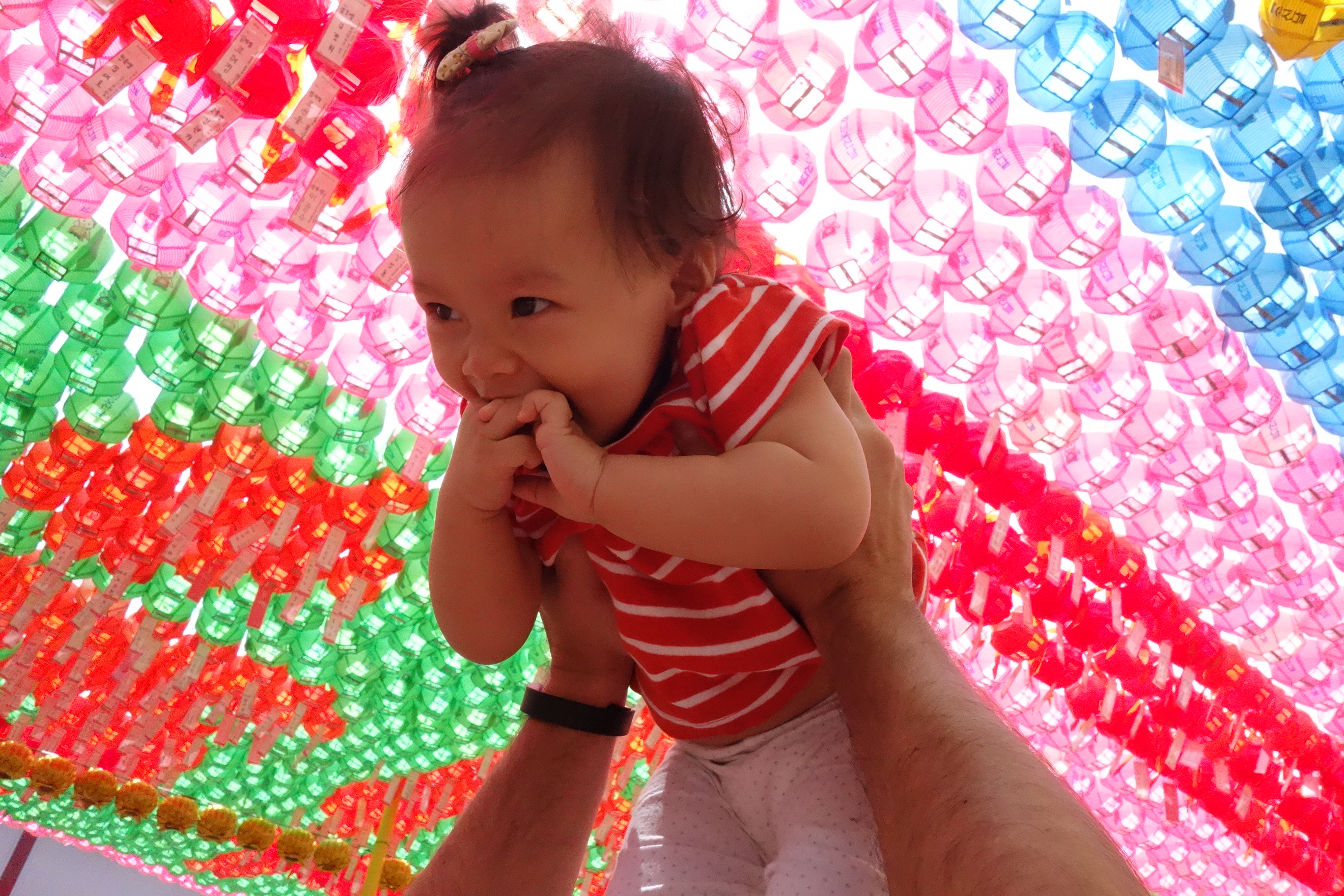 One of Seoul’s big celebrations each May is Buddha’s Birthday, where the temples get decked out in colorful lanterns and the street cutting in front of Seoul’s showcase temple, Jogyesa, is lined with tents full of activities for kids and adults to celebrate the ‘birthday’ event. We took the fam on Sunday and Isa mainly just rode on Mom and Dad, but she enjoyed all the colors of the temple.