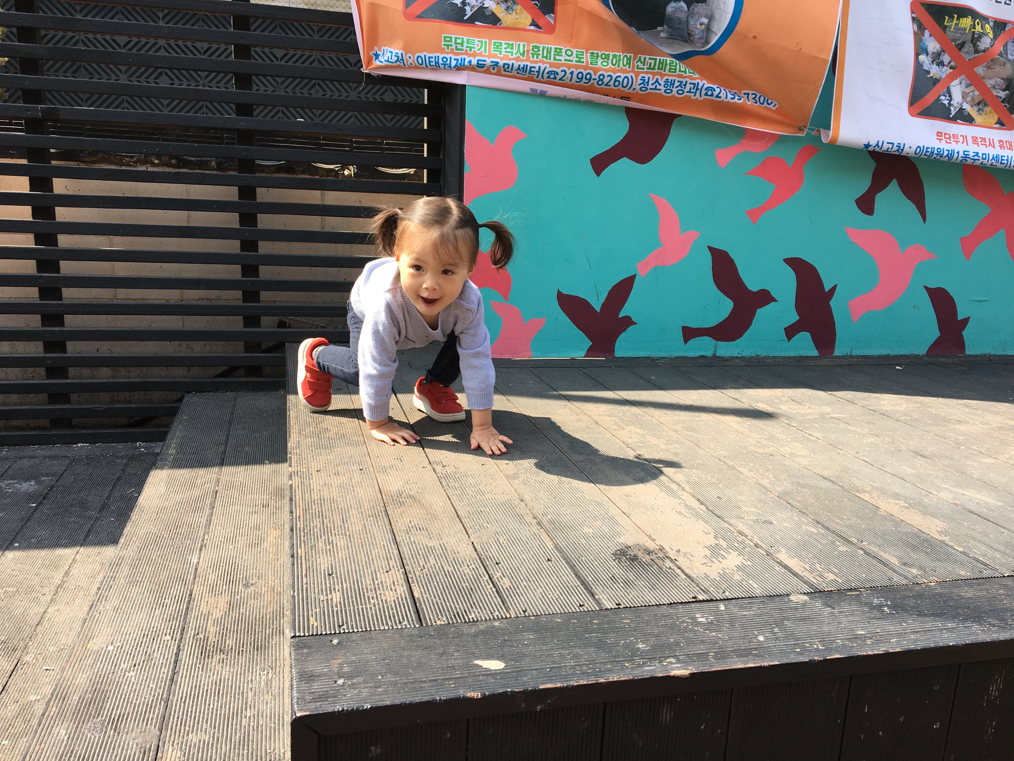 Isa’s not really toddling around but speeding around now that she’s 20 months old. On Sunday we hosted a quick brunch with Uncle Ben, Momma’s old friend from Washington, who now lives in Beijing. Isa and Eva had so many pastries and they needed to run off all that sugar on some decks outside the restaurant.
