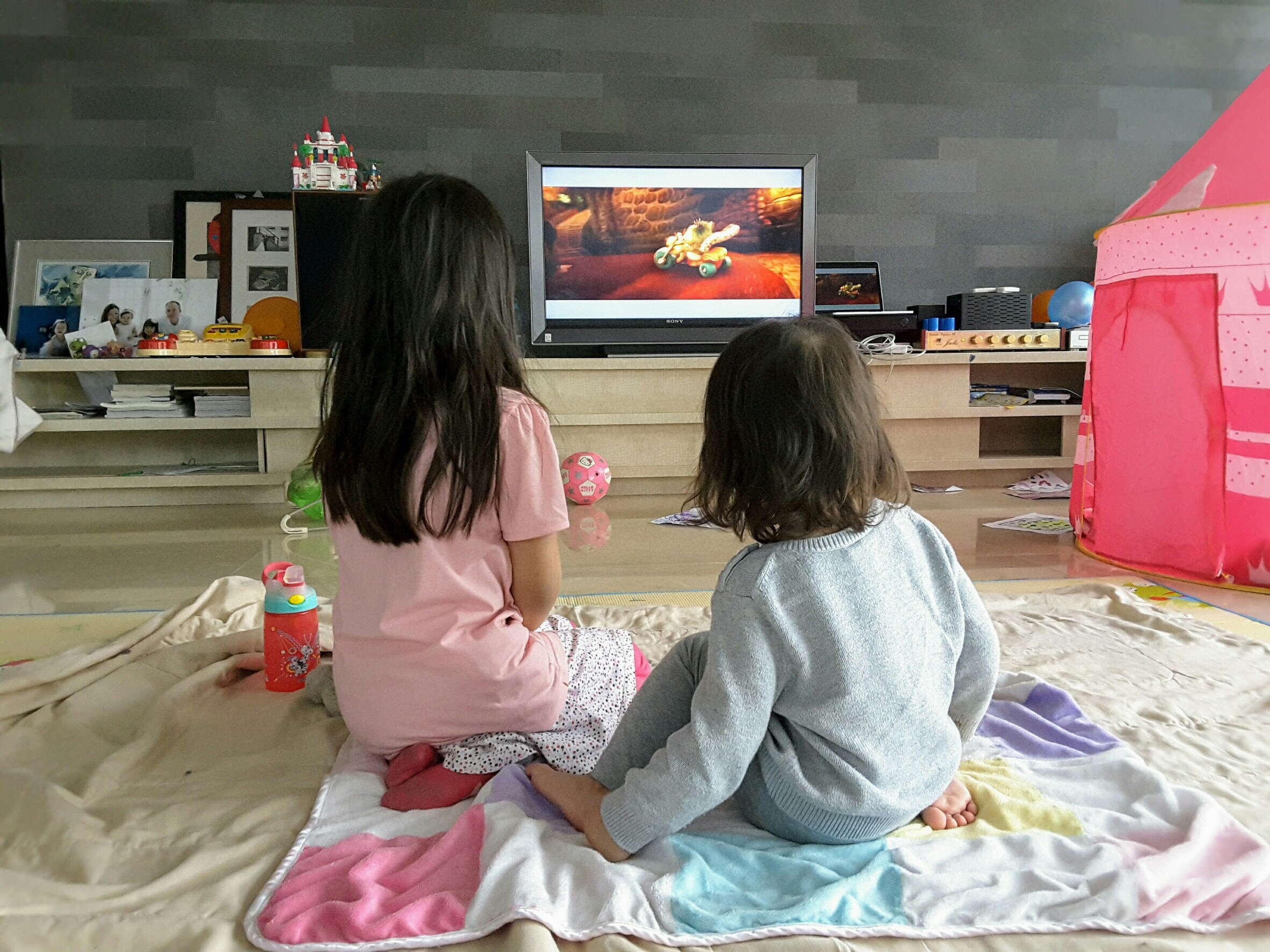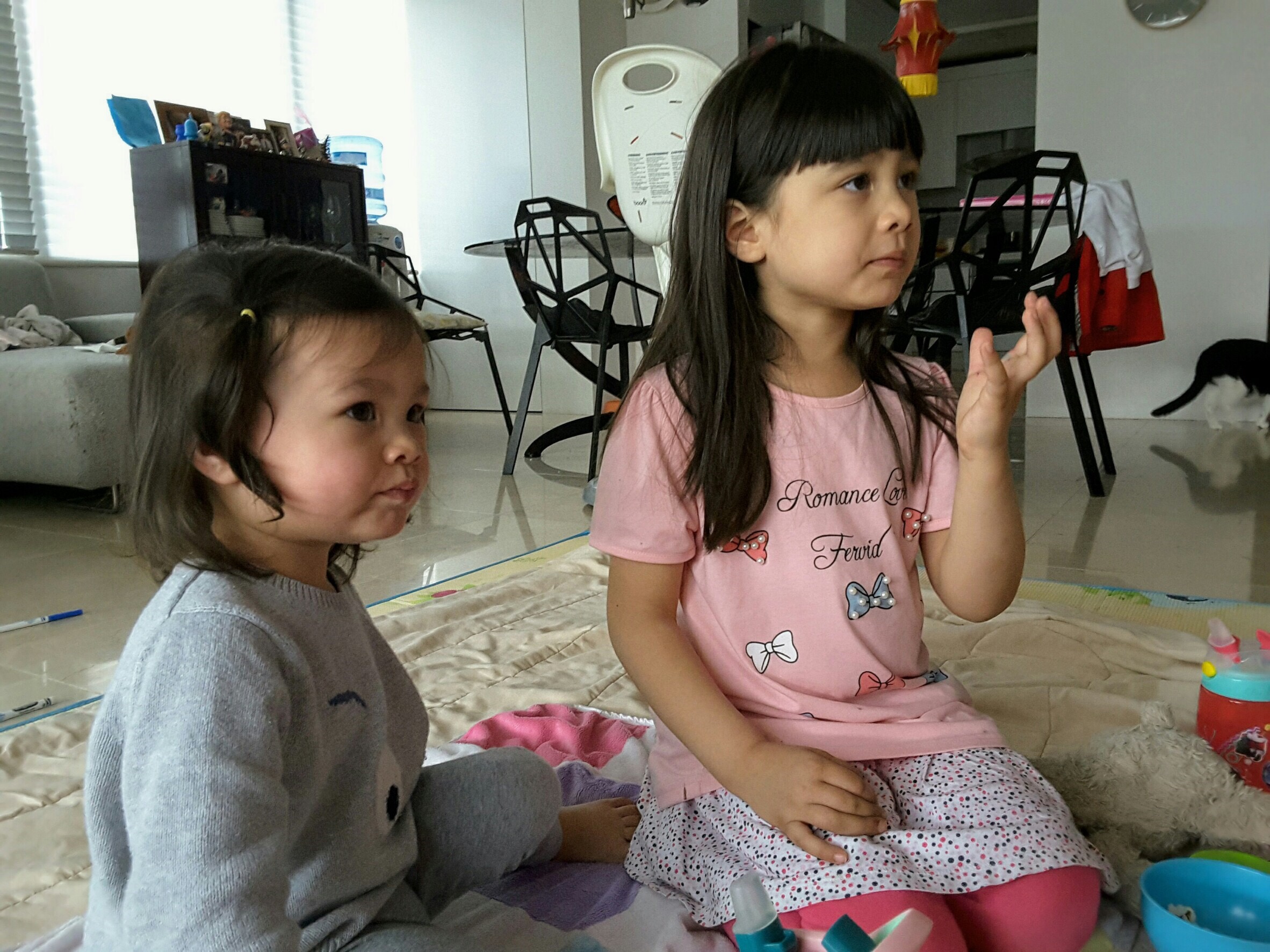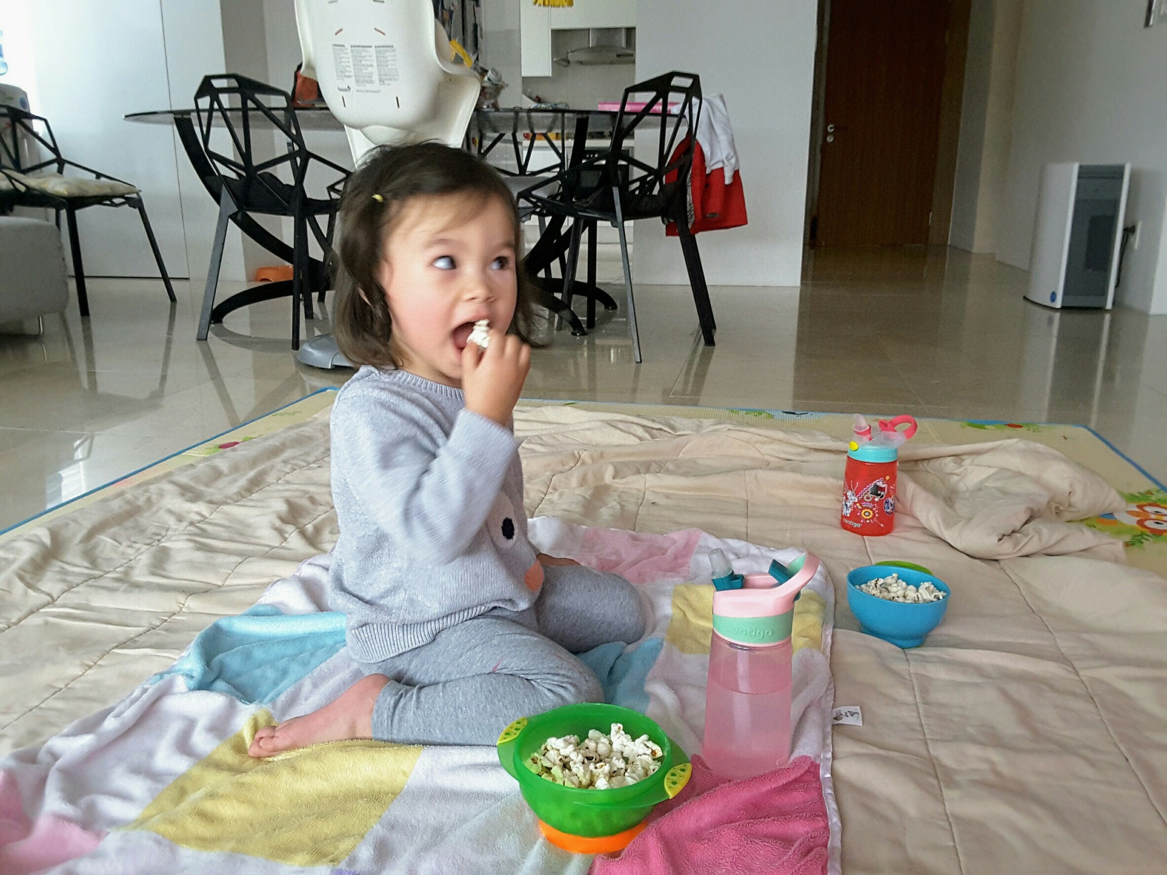 The girls have one night a week when they’re allowed to watch a movie, and it’s become a Sunday ritual. They lay out a mat in the middle of the living room and each get a bowl of popcorn. Isa is especially into it, until her older sister gets territorial about space and inevitably tries to encroach into Isa’s, which is also part of the Sunday tradition.