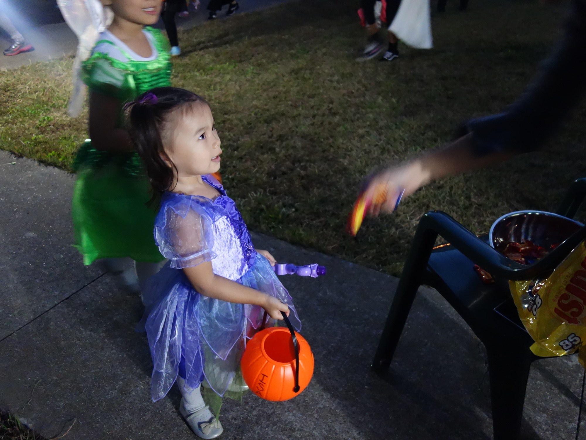 But it all worked out because now Isa is old enough to walk around and actually collect candy, and her sister is old enough to take her around and guide her. They both had different costumes for school Halloween celebrations on Friday and then decided on Saturday at the last minute to be fairies together, like they did for a party last year. Isa refused to wear her wings but she was happy to be color-coordinated with her sister and they had a great, great time. Isa didn’t want to stop but bedtime beckoned.