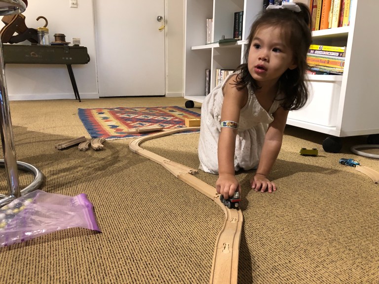 Isa slept though afternoon swim time but she found the train set. She’s real into transportation.