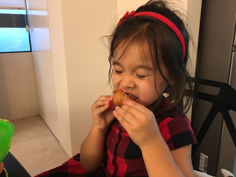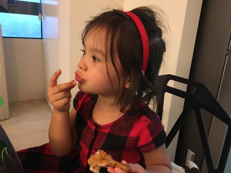 Isa’s favorite food besides bananas (and any sweet treats) is fried chicken. I got some vid and photos of her chowing today.
