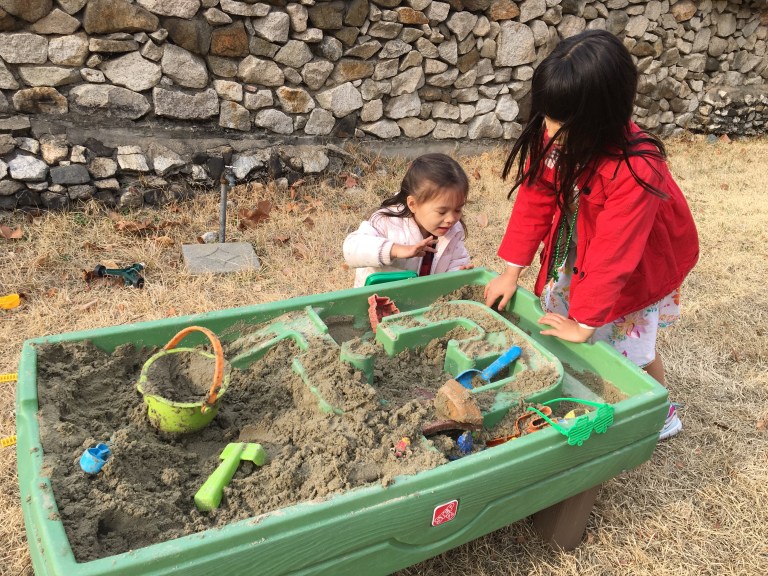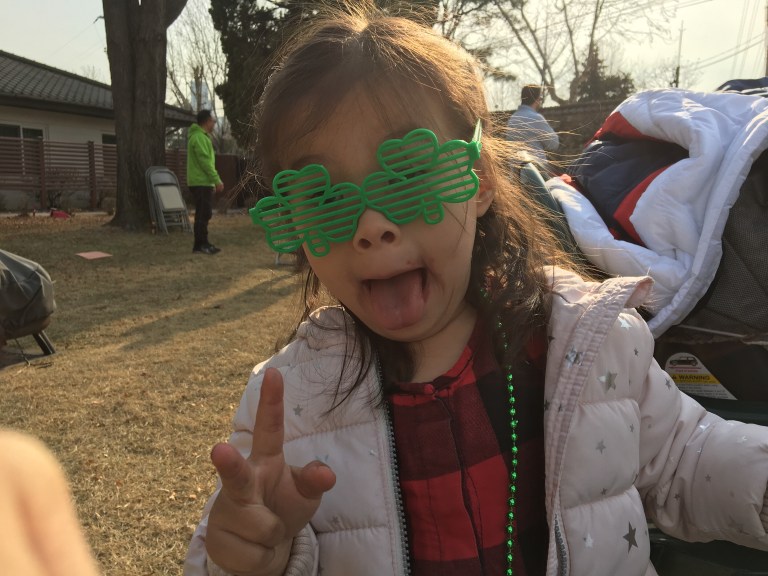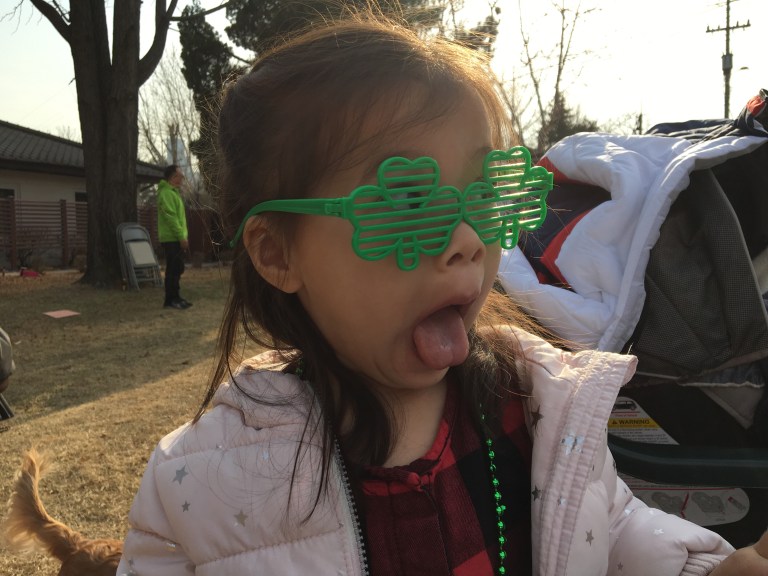 Ida and Eva had a busy day outside for St Patrick’s Day, as we had a morning at the park and then afternoon on base for a birthday party. Isa wasn’t crazy about the bouncy house but did it anyway, then spent a lot of time guarding a corner of the sandbox that she didn’t want anyone else to mess with.