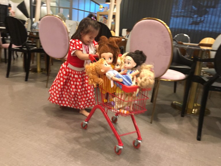 Isa has been really into girly accessories and dressing up since before she could walk and talk. She used to wear beads and purses and crawl around the floor. Now she changes into three or for dresses a day. So Liliput kid cafe, which offers a rack of princess dresses and other costumes, is one of her favorite places to go. The girls found a scepter today and fought over it … now I know what to get them for birthday gifts.