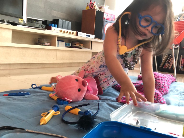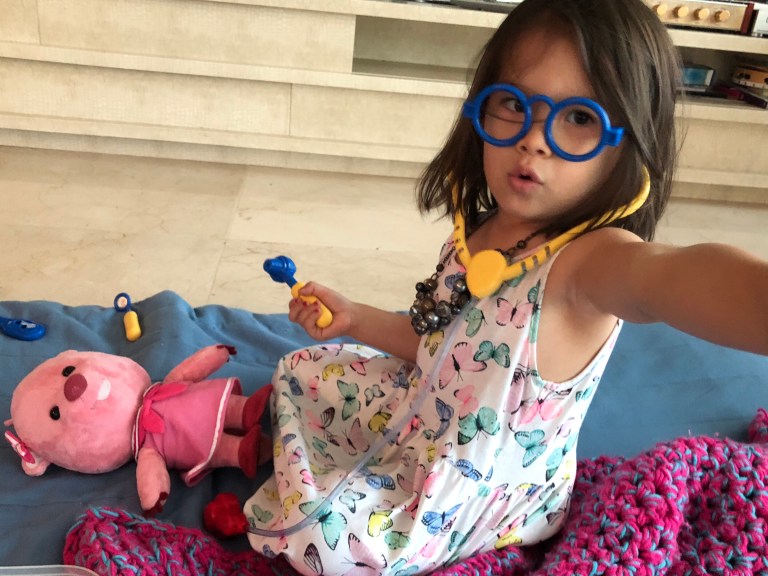 No one loves dressing up more than Isa, who counts dress up as her favorite activity and changes outfits about four times a day, at least. She also sleeps in dresses. Lately she wants to be a doctor and specifically an ear doctor. Here she is examining Ruby the beaver.