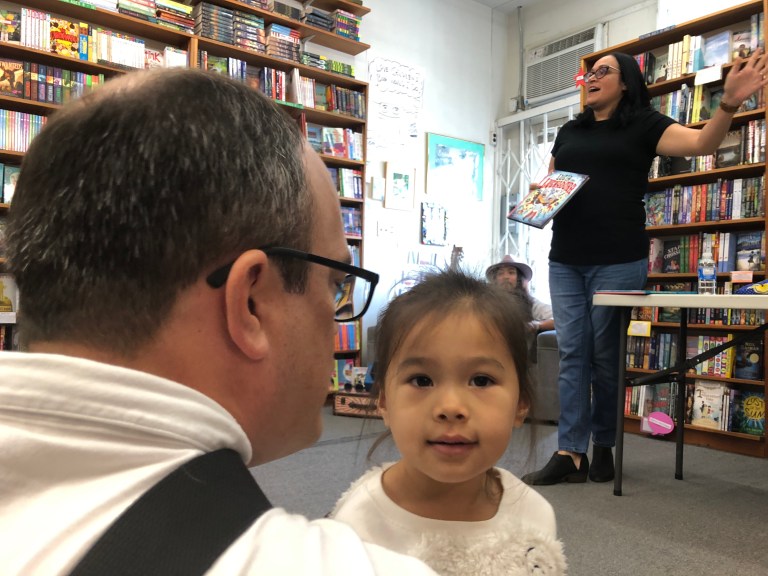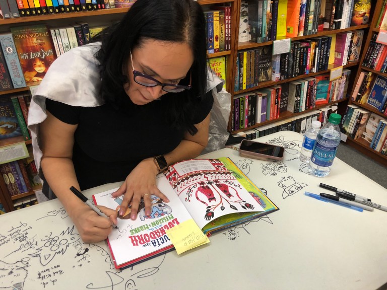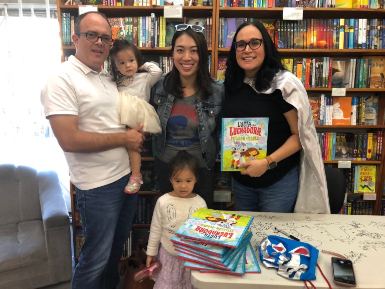 Our friend Cynthia is the author of the Lucia the Luchadora books and was in town for a reading at Children’s Book World. We were delighted to see her and get her to sign our Lucia books!