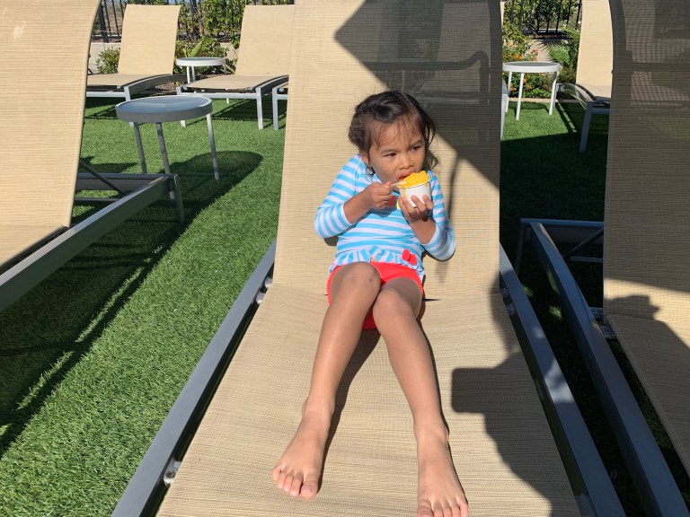 After we came back to the hotel she took a dip in the pool with mom and devoured mango gelato.