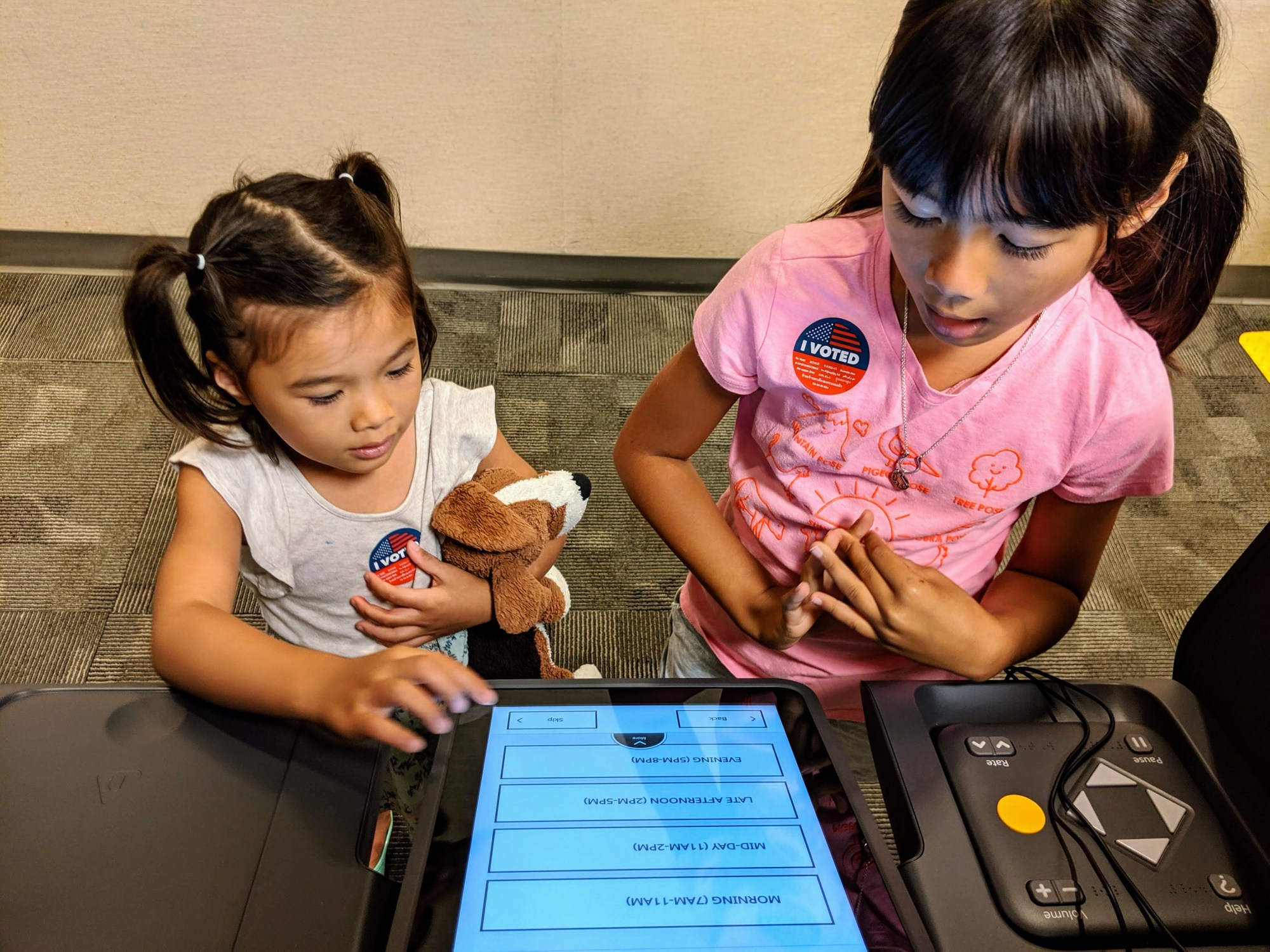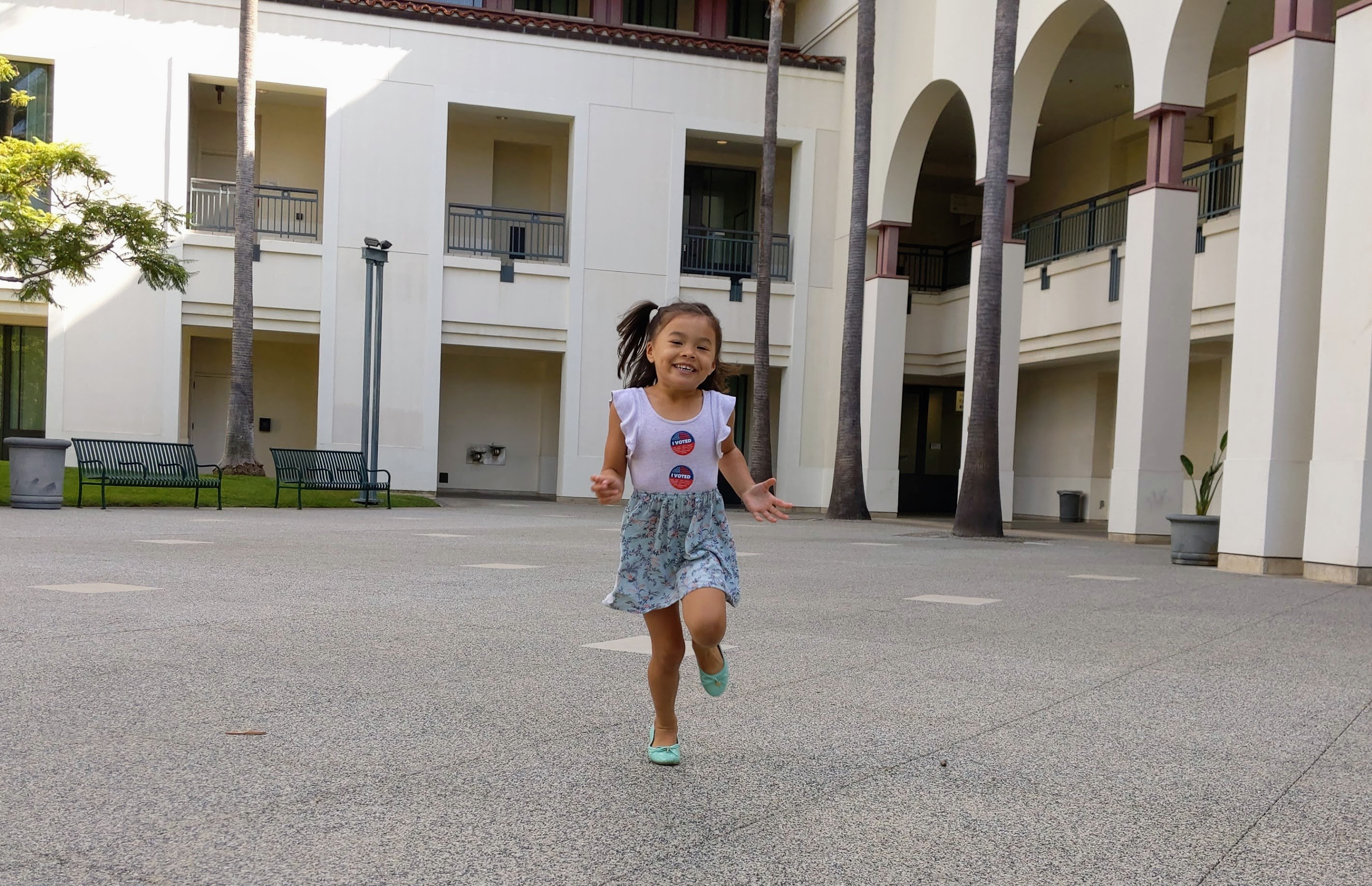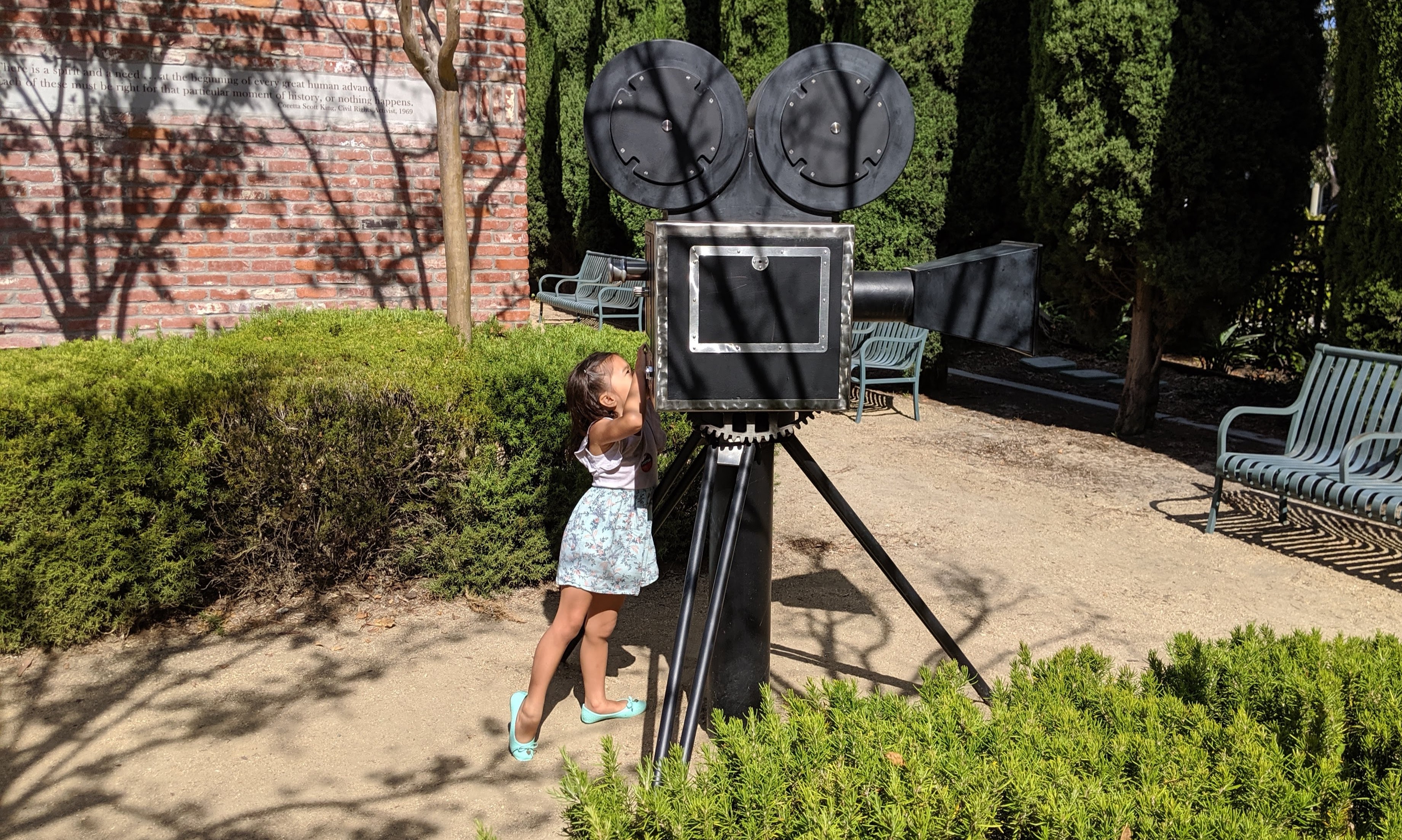 Isa joined her sister in testing out Los Angeles County’s new voting experience during the recent mock election (where kids could get their own ballots). She made selections on the county’s new state-of-the-art ballot-marking devices but also enjoyed exploring Culver City City Hall — an impressive art deco style building with beautiful gardens filled with plaques and props, such as a large fake motion picture camera. Good times!
