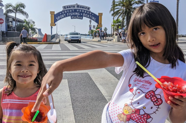 It’s November in Southern California, which means the weather is perfect for outdoor adventures with Dad, who recently took Isa and her sister, Eva, to nearby Santa Monica. The girls visited the iconic pier, enjoying some snow cones, and then headed over to Tongva Park for some shenanigans under the sunshine. Good times.