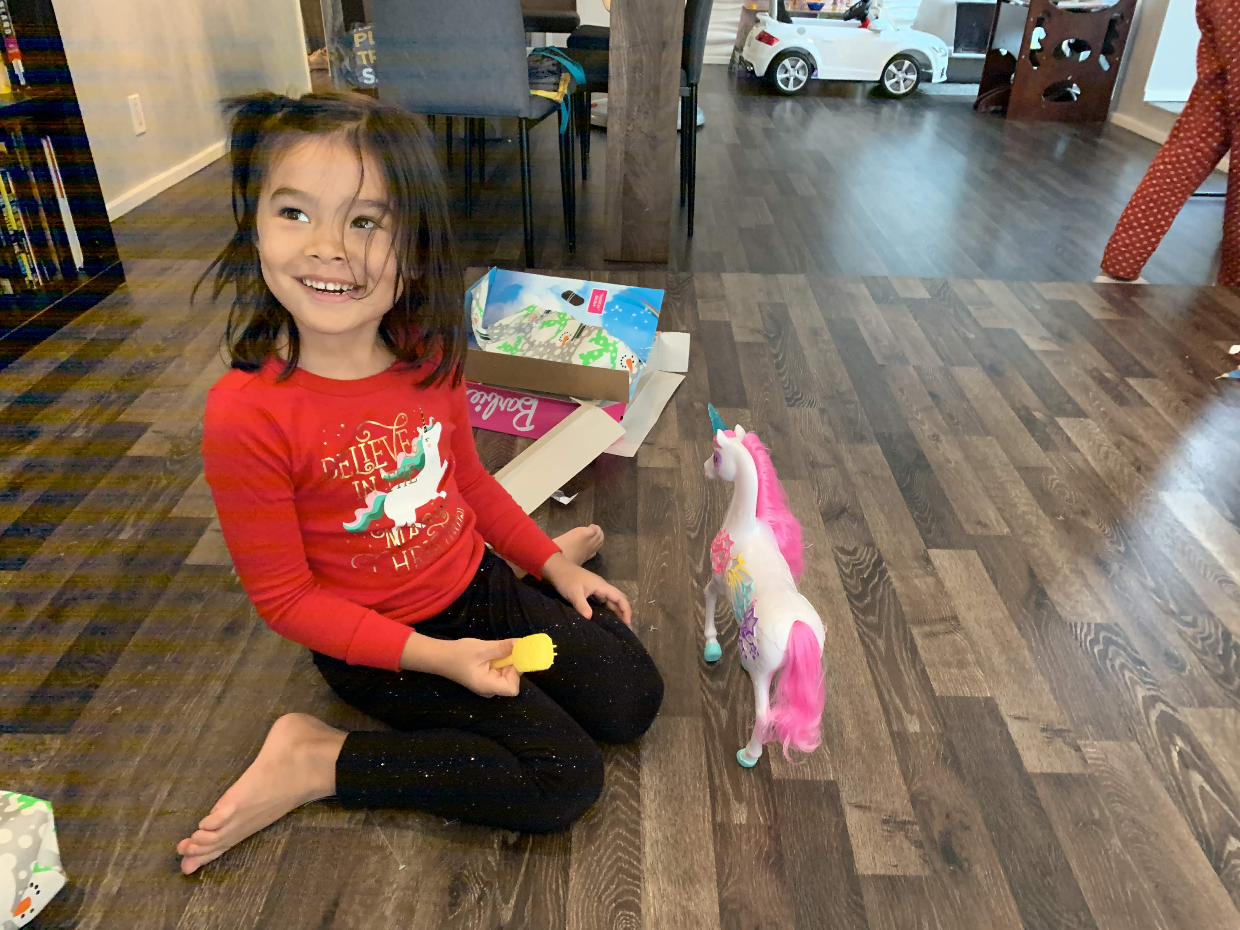 Her poses improved throughout Christmas Day, when she received a fancy new Barbie unicorn, Polaroid camera and numerous plush toys, among many gifts.