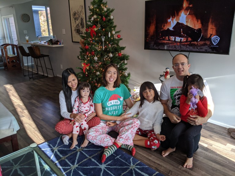 Isabel can sometimes be wary of unfamiliar experiences, preferring to observe a room or distract herself a bit before participating. Perhaps that’s what happened today when she covered her face (in this take, at least) for the family Christmas photo.