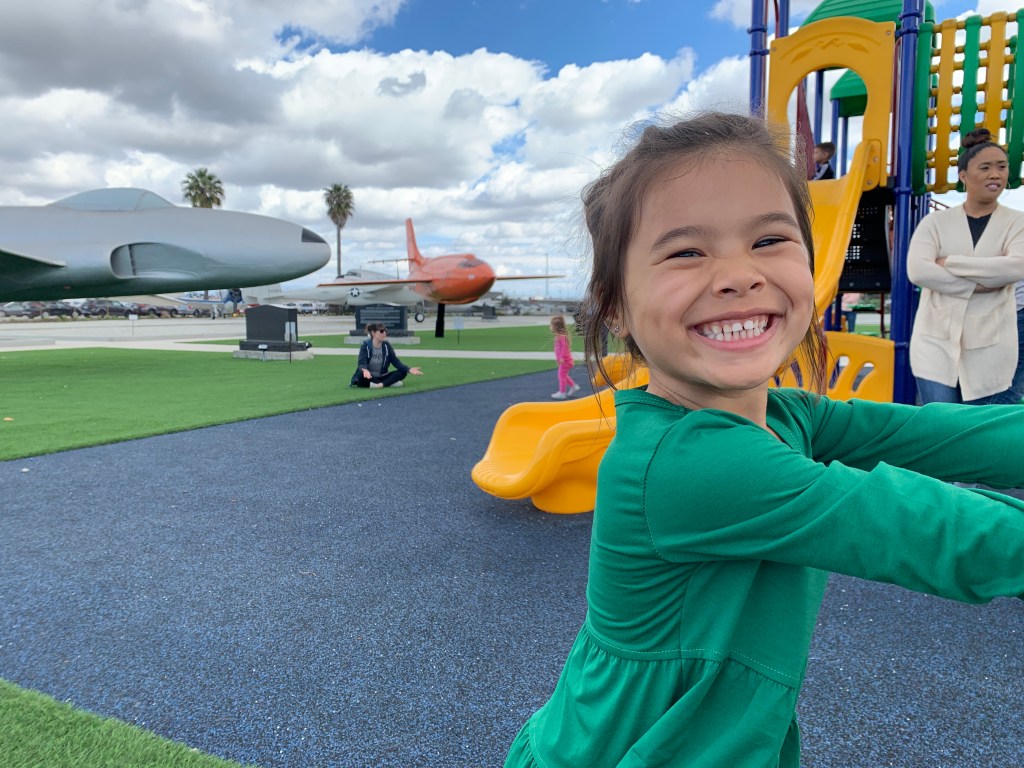 There’s an awesome restaurant by LAX where the planes fly right over you and the back of it has a huge playground and AstroTurf green space. That’s where Isas friend Emerie threw her birthday party, and at least until Isa’s major meltdown, she has an awesome time.