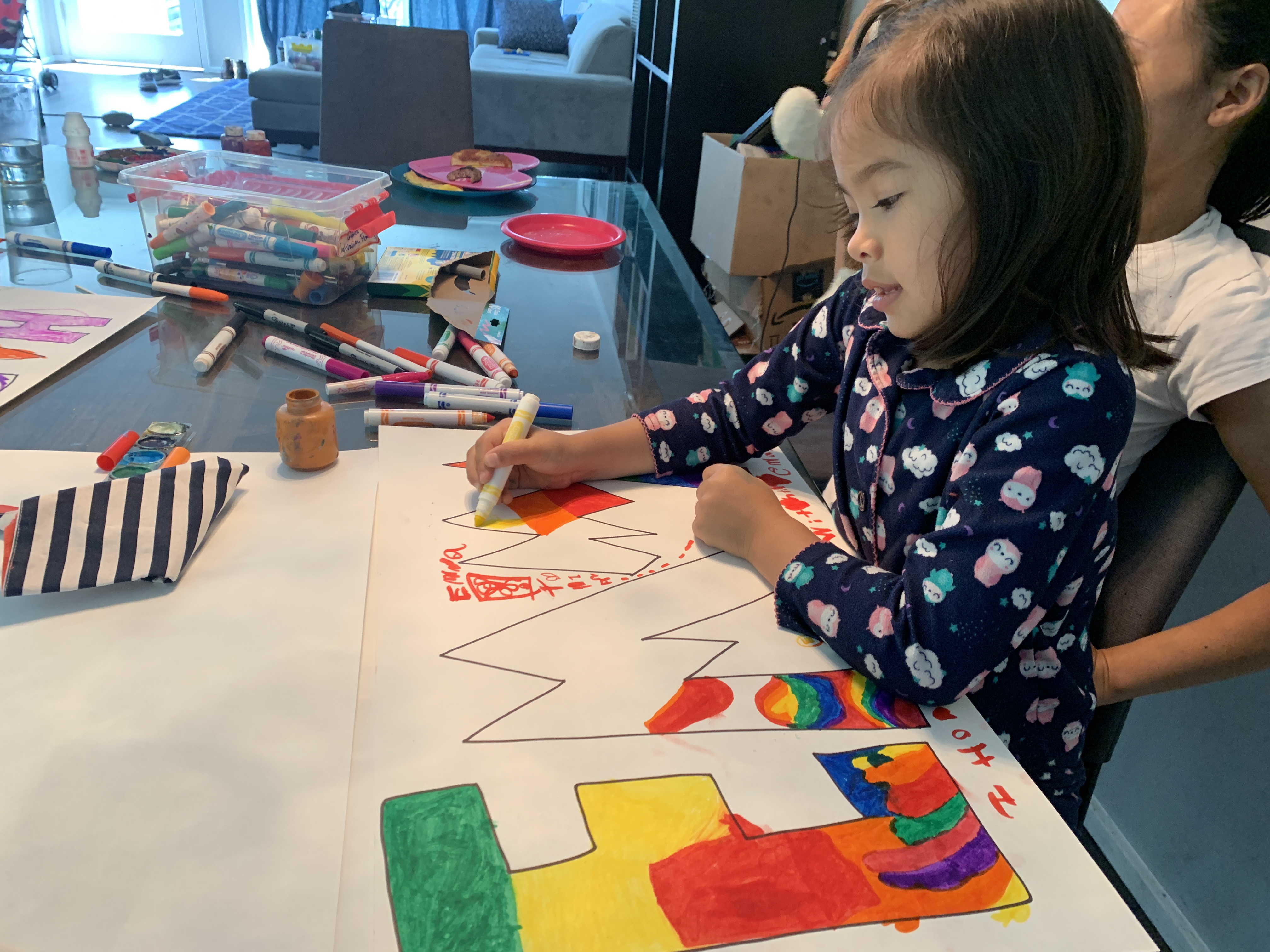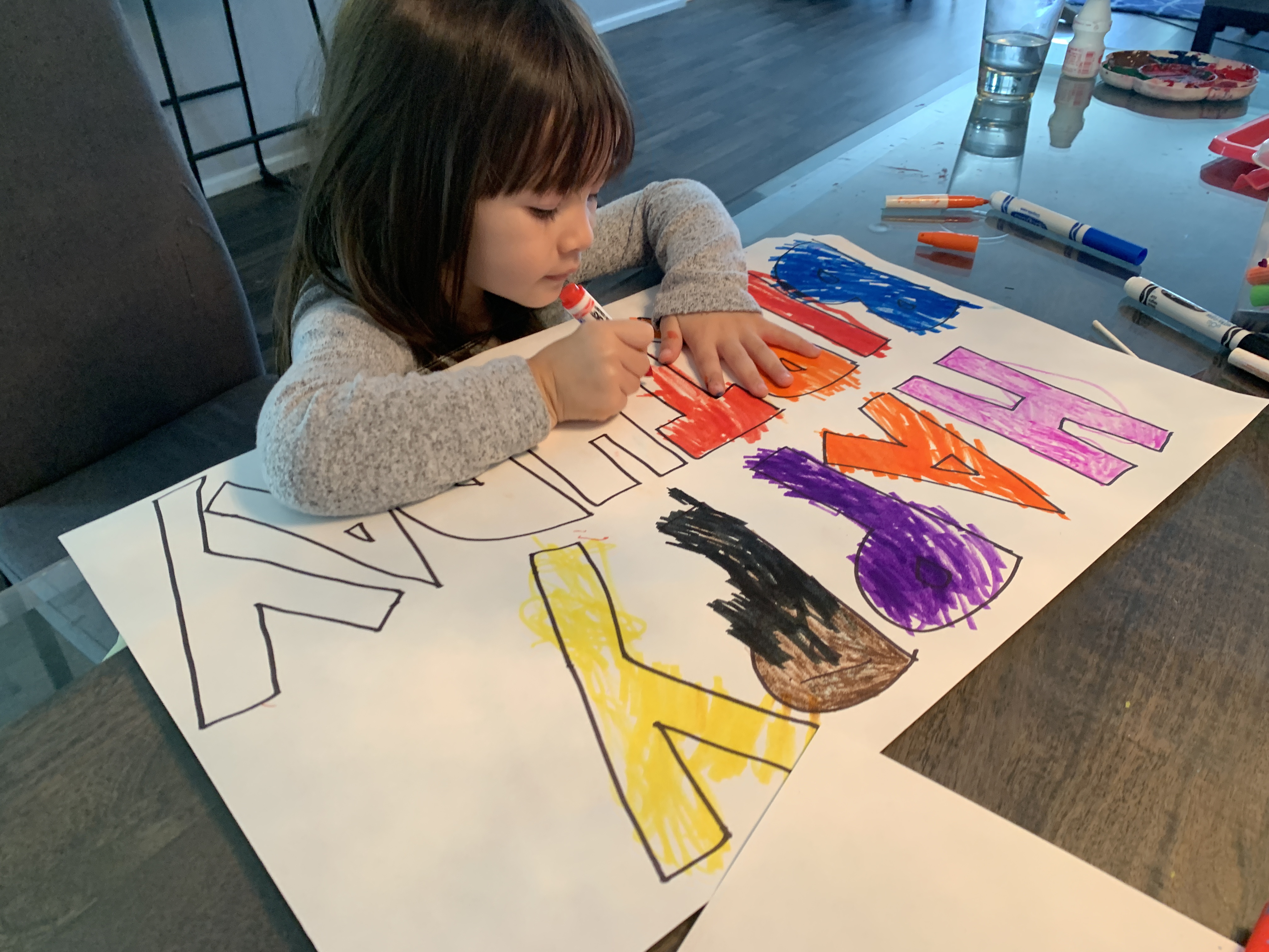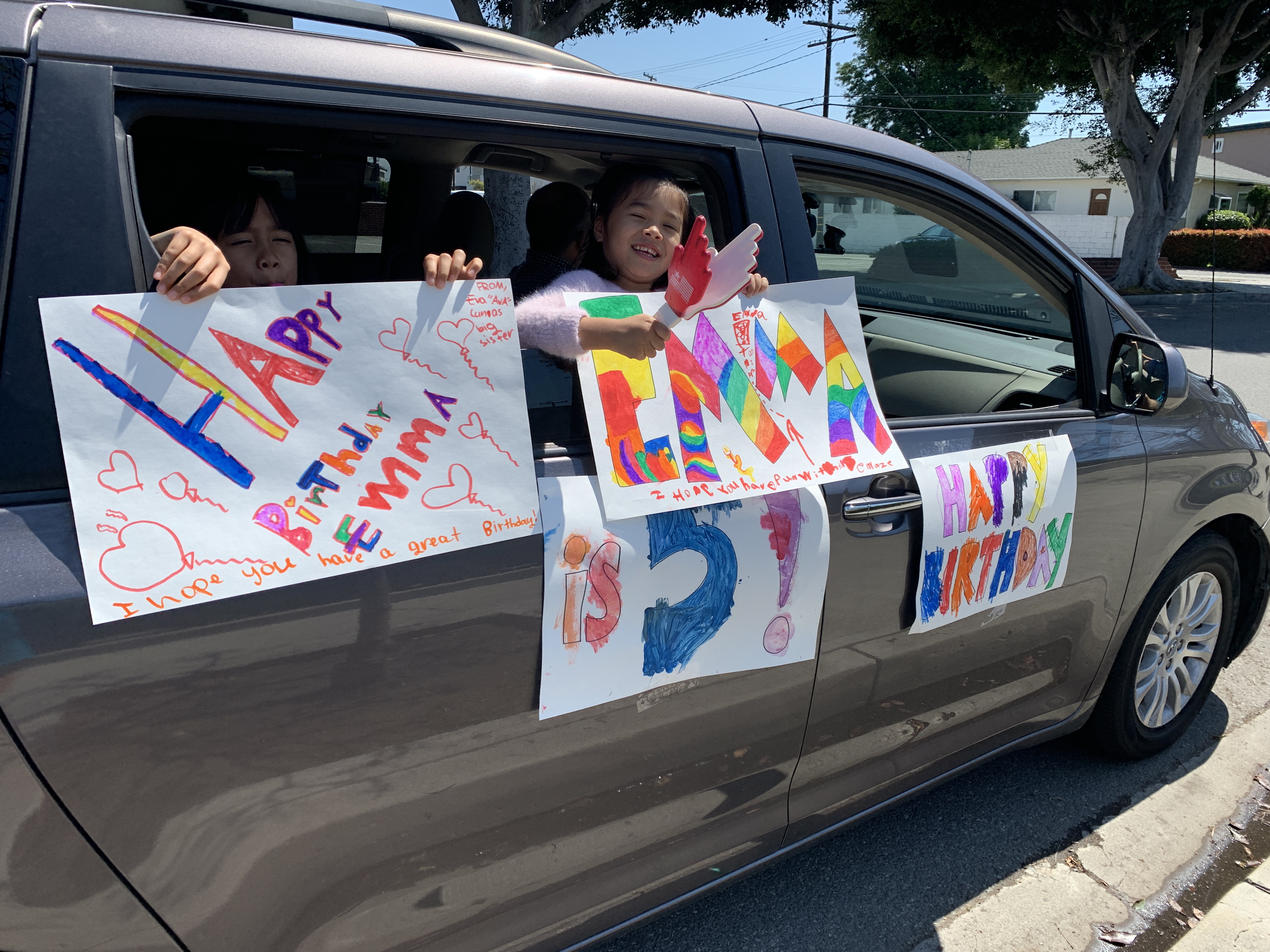 Isas good friend Emma turned five this weekend but we couldn’t party. So we took part in a “parade” in front of Emma’s house to wish her a happy day and to make sure she could see her friends. We blasted happy birthday from the car, made colorful posters we held out the windows and used noisemakers to celebrate Emma.